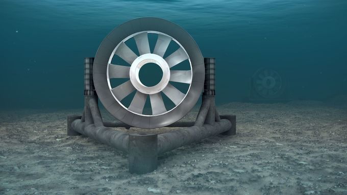 Le diamètre de la turbine est de 16 m, soit 21 m de hauteur totale. Immergées par 35 m de fond, elles reposent sur un trépied – ce qui réduit l’impact sur la faune et la flore benthiques – et ne tournent qu’à 7 tours par minute autour d’un moyeu évidé, ce qui permet aux poissons de les traverser sans dommages![]()
